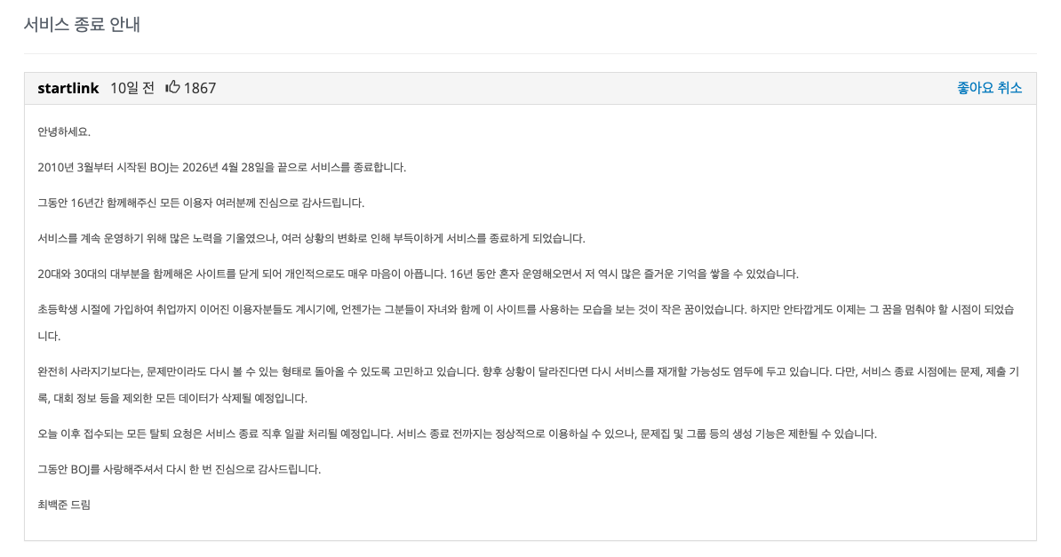 슬랙에 뉴스 테크를 보다가 충격적인 내용을 보게되었다… 백준 온라인 저지가 서비스 종료를 한다는 이야기였다…